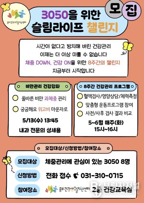 브릿지저널 김경미 기자 | 시흥시 중부건강생활지원센터는 비만 위험 요인이 있는 30~50대 성인을 대상으로 건강한 생활 습관 형성과 만성질환 예방을 위한 ‘슬림라이프 챌린지’를 운영하며 참여자를 모집한다.
