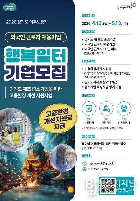 브릿지저널 김경미 기자 | 경기도와 경기도일자리재단은 도내 외국인 근로자를 고용한 중소 제조기업을 대상으로 ‘2026년 경기도 이주노동자 행복일터 선정사업’ 참여기업을 모집한다고 20일 밝혔다.