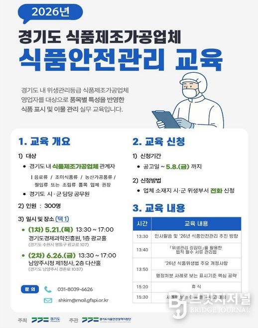 브릿지저널 김경미 기자 | 경기도는 도내 식품제조·가공업체의 자율적 위생관리 역량을 강화하기 위해 ‘도내 식품제조·가공업체 위생관리 교육’ 참여자를 모집한다고 20일 밝혔다.