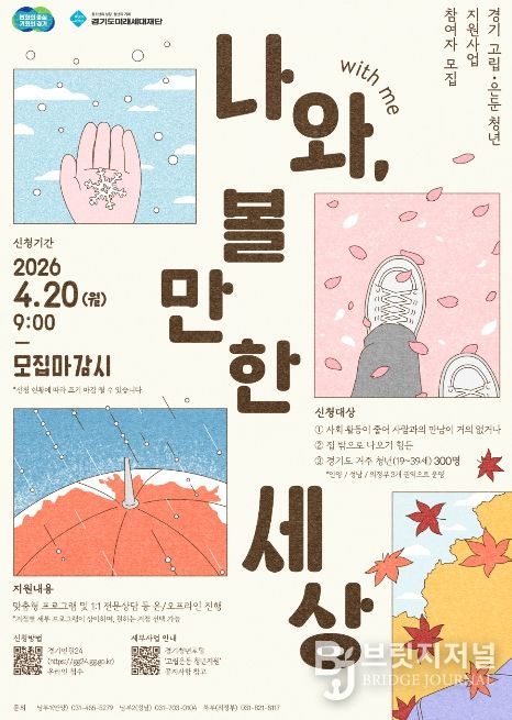 브릿지저널 김경미 기자 | 경기도가 사회적 관계가 단절된 고립·은둔 청년의 일상 회복을 돕기 위해 20일부터 ‘경기 고립·은둔 청년 지원사업: 나와(with me), 볼만한 세상’ 참여자 300명을 모집한다.