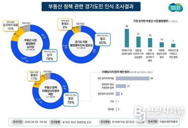 브릿지저널 김경미 기자 | 경기도민의 78%는 현재 부동산 시장의 불법행위를 심각하게 인식하고 있으며 경기도 차원의 단속 강화 필요성에는 90% 도민이 공감한다는 조사결과가 나왔다.