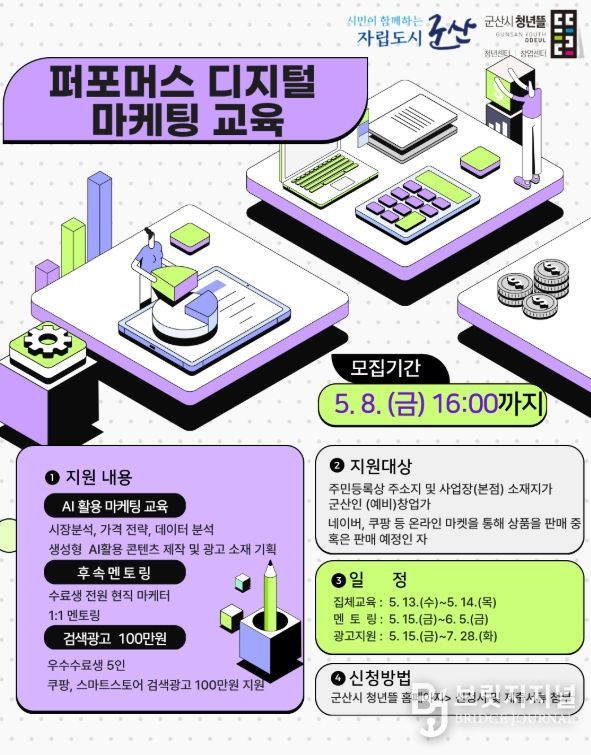 브릿지저널 윤나영 기자 | 군산시 청년뜰 창업센터가 4월 20일부터 5월 8일까지 지역 온라인 창업가의 디지털 마케팅 역량 강화를 위한 '2026년 퍼포먼스 디지털 마케팅 교육' 참여자를 모집한다.