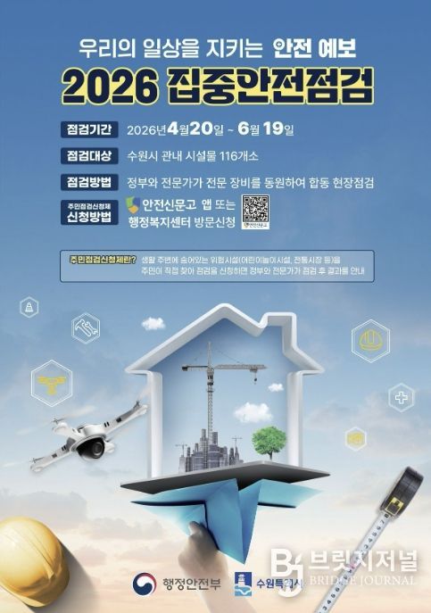 브릿지저널 김경미 기자 | 수원특례시가 안전사고를 예방하고, 시민의 안전 의식을 고취하기 위해 20일부터 6월 19일까지 ‘2026년 집중안전점검’을 한다.