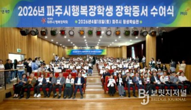 브릿지저널 김경미 기자 | 파주시는 (재)파주시행복장학회가 지난 18일 파주시 평생학습관 대공연장에서 학부모와 장학생 등 200여 명이 참석한 가운데 2026년 장학증서 수여식을 개최했다고 밝혔다.