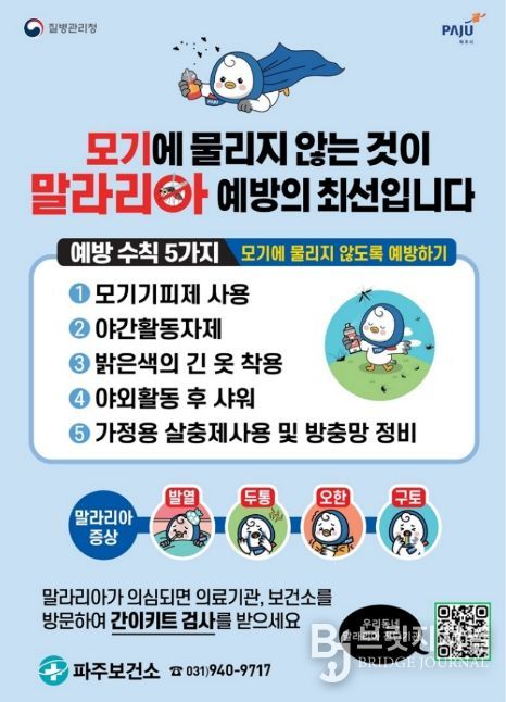브릿지저널 김경미 기자 | 파주시는 말라리아의 조기진단과 체계적인 대응을 위해 관내 의료기관 90곳을 ‘우리동네 말라리아 진단기관’으로 지정하고 운영을 강화한다.