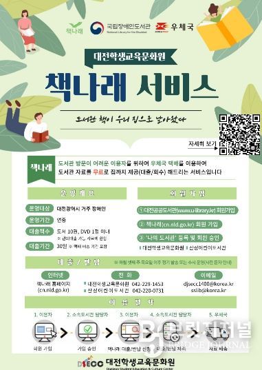 브릿지저널 정보영 기자 | 대전학생교육문화원은 봄철 외부 활동이 어려운 장애인과 65세 이상 어르신 등 독서 소외계층의 책 읽는 즐거움을 위해, 비대면 도서 대출 및 반납 서비스인 ‘책나래’ 사업을 4월부터 본격 추진한다고 밝혔다.
