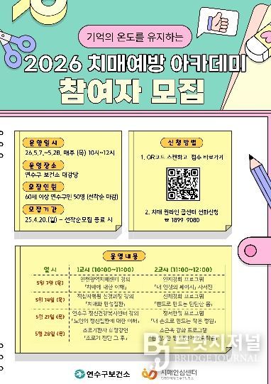 브릿지저널 김경미 기자 | 연수구는 다음 달 7일부터 28일까지 치매 발병 지연과 예방을 위한 ‘2026 치매예방 아카데미’를 운영한다.