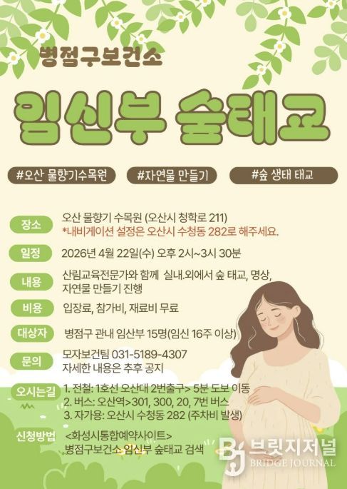 브릿지저널 김경미 기자 | 화성특례시 병점구보건소는 임신부의 정서적 안정과 건강한 출산을 지원하기 위해 오는 22일 ‘임신부 숲태교 프로그램’을 운영한다고 밝혔다.