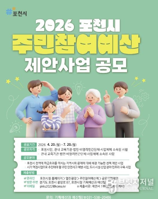 브릿지저널 김경미 기자 | 포천시가 4월 20일부터 오는 7월 20일까지 2027년도 예산편성을 위한 주민참여예산 공모제안사업을 접수하고 있다.
