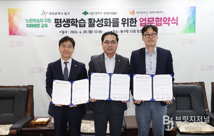 브릿지저널 정보영 기자 | 대전 동구는 20일 대전대학교 RISE사업단‧대전시치매센터와 ‘느린학습자 평생교육 지원’과 ‘치매예방 프로그램 운영’을 위한 업무협약을 체결했다고 밝혔다.