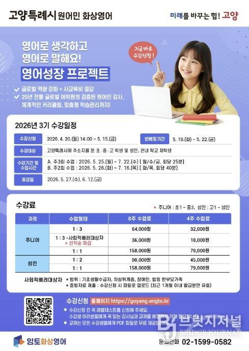 브릿지저널 김경미 기자 | 고양특례시는 글로벌 역량 강화와 사교육비 부담 완화를 위한 ‘원어민 화상영어’ 프로그램의 3기 수강생을 4월 20일부터 5월 15일까지 모집한다.