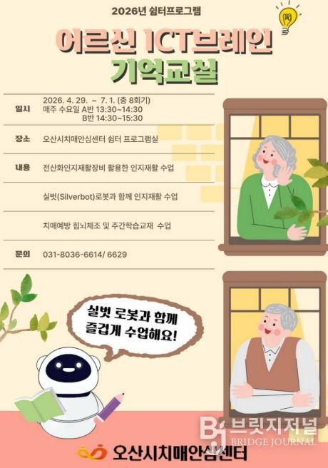 브릿지저널 김경미 기자 | 오산시치매안심센터는 오는 4월 29일부터 경증 치매환자를 위한 쉼터 프로그램 ‘ICT 브레인 기억 교실’을 운영한다고 밝혔다.