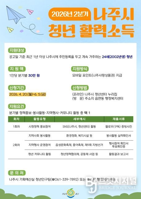 브릿지저널 김경미 기자 | 전남 나주시가 지역 청년의 사회참여 확대와 안정적 정착을 지원하기 위해 공공활동 참여를 조건으로 분기별 30만 원을 지급하는 ‘청년 활력소득 지원사업’ 2분기 참여자 모집에 나선다.