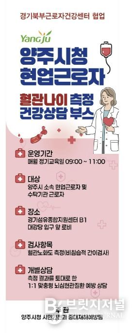 브릿지저널 김경미 기자 | 양주시가 현업근로자의 건강 증진과 뇌심혈관계질환 예방을 위해 오는 4월 22일부터 연말까지 ‘찾아가는 근로자 건강상담 부스’를 운영한다.