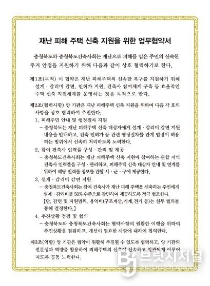 브릿지저널 김경미 기자 | 충북도가 20일 집중호우 등 각종 자연재난으로 생활 터전을 잃은 도민들의 신속한 일상 회복을 위하여 충북건축사회(회장 김종도)와 업무협약을 체결했다.