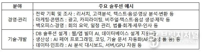 국내 유망 AI 벤처·스타트업을 대상으로 3월 9일부터 27일까지 AI 솔루션을 공모하여 총 370개를 접수했고, 접수된 370개 중 전략 기획, 마케팅·경영 등 ‘경영·관리 분야’에 270여개, 데이터·인프라, 프로그래밍 등 ‘기술·개발’ 분야에 100여개가 모집됐다.