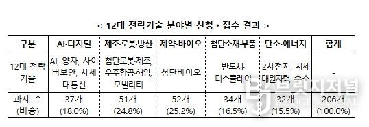 이번 공모는 12대 전략기술 분야를 중심으로 진행된 이번 공모는, 5대 전략기술 그룹 단위로는 제약·바이오 분야에 52개(25.2%), 제조·로봇·방산에 51개(24.8%), 인공지능(이하 AI)·디지털에 37개(18.0%) 등이 접수됐으며, 총 206개 접수 과제에 1,183개 기업·연구소 등이 참여 신청했다.