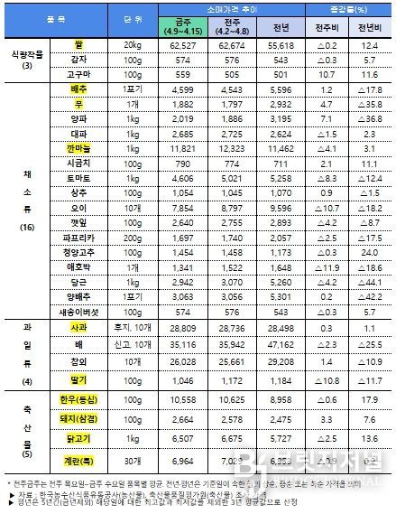 점검 결과, 농산물은 대다수 품목이 전년 대비 낮은 수준이다. 특히, 양파, 양배추, 당근 등 노지채소류는 가격이 큰 폭으로 하락함에 따라 시장격리, 정부 비축물량 출하정지와 함께 소비촉진을 추진하고 있다.