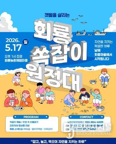 브릿지저널 김경미 기자 | 남해관광문화재단은 ‘2026 지역민 주도 소규모 축제 개최 지원 사업’의 일환으로 오는 5월 17일 일요일 오후 1시 ‘갯벌을 살리는 회룡 쏙잡이 원정대’ 축제를 개최한다.