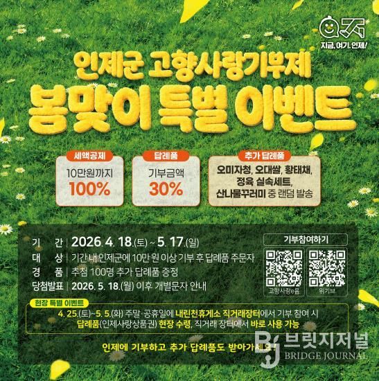김장웅 인제군 지역발전과장은 “봄철 인제군을 찾는 방문객들에게 고향사랑기부제를 자연스럽게 알리고 참여를 독려하기 위해 이번 이벤트를 마련했다”며, “고향을 사랑하는 마음으로 기부하고 세액공제와 답례품 혜택은 물론, 지역 농특산물 소비 활성화에도 동참하는 뜻깊은 기회가 되길 바란다”고 말했다.