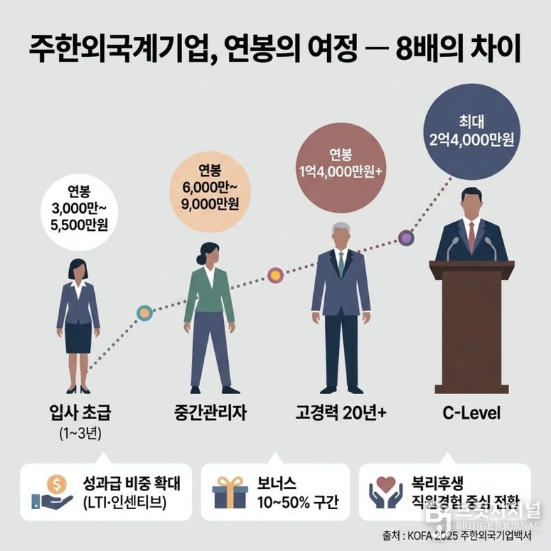 KOFA는 “이번 백서는 단순 평균이 아닌 최저·중간·최고값 기반의 구조 분석을 통해 외국계기업 보상체계의 실질적인 분포를 보다 정밀하게 제시했다”고 밝혔다. 2025년 기준 외국계기업의 임금 인상률은 대부분 3~5% 구간에 집중된 것으로 나타났다. 이는 전반적으로 안정적인 임금 상승 흐름을 유지하고 있음을 보여준다. 다만 이번 조사에서 주목할 점은 보상 구조의 변화이다. 과거 기본급 중심의 보상 체계에서 벗어나 성과급, 인센티브, 장기보상(LTI) 등 변동급 비중을 확대하는 방향으로 전환되고 있는 것으로 분석됐다. 이는 글로벌 기업들이 성과 중심 보상 체계를 강화하고 있음을 의미한다.