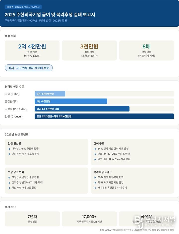 브릿지저널 김경미 기자 | 주한외국기업연합회(상임대표 김종철, KOFA)는 ‘2025 주한외국기업백서’ 혁신판을 발표하고, 작년 6월 실시한 주한외국기업 급여 및 상여금 실태조사와 함께 복리후생 조사 결과를 포함해 공개했다. 이번 백서는 7년째 발간되는 자료로, 기존 조사 대비 한층 고도화된 분석 체계를 적용해 글로벌 전문 조사기관 수준의 HR 리포트로 업그레이드됐다는 평가를 받고 있다.