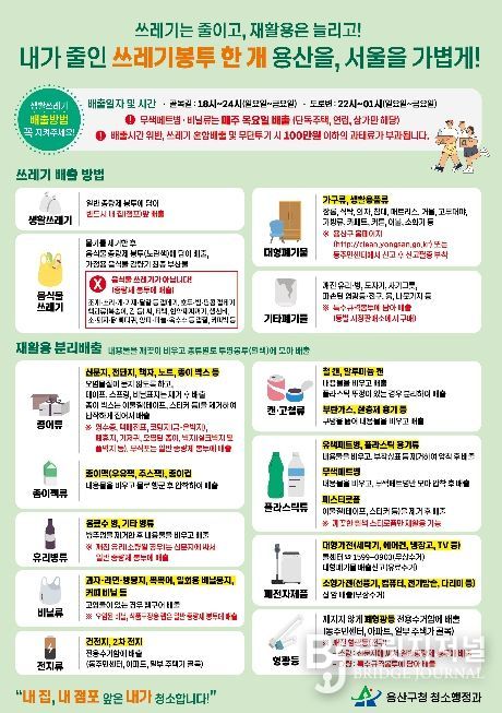 브릿지저널 김경미 기자 | 서울 용산구가 주민 누구나 생활쓰레기 분리배출 정보를 쉽게 이해하고 실천할 수 있도록 주요 배출 정보를 한 장에 담은 안내문을 제작·배포한다.