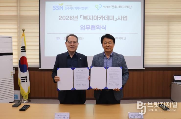 브릿지저널 김경미 기자 | 진주시복지재단은 지난 20일 재단 회의실에서 진주시사회복지협의회(회장 김기호)와 ‘2026년 복지아카데미 교육 및 사례관리 교육사업’ 운영을 위한 업무협약을 체결했다.