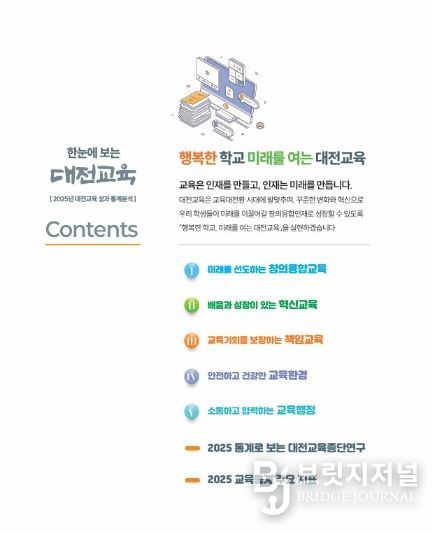 브릿지저널 정보영 기자 | 대전교육과학연구원 대전교육정책연구소는 2025년 대전교육 주요 정책의 성과를 종합적으로 분석한 ‘한눈에 보는 대전교육’을 발간했다고 밝혔다.