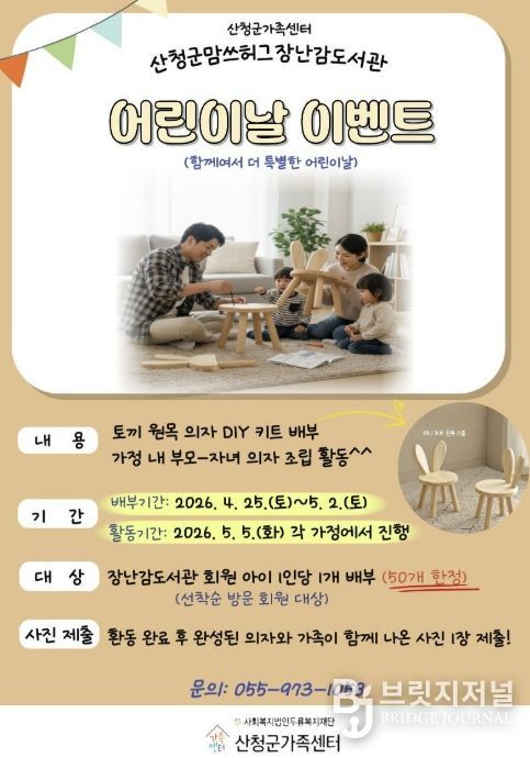 브릿지저널 김경미 기자 | 산청군가족센터는 어린이날을 맞아 ‘함께여서 더 특별한 어린이날’사업을 추진한다고 21일 밝혔다.