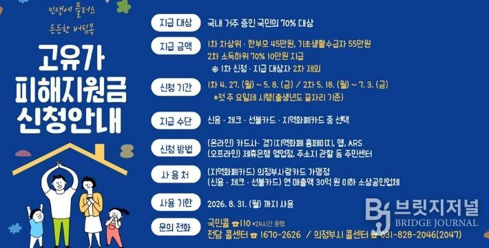 브릿지저널 김경미 기자 | 의정부시는 중동전쟁으로 촉발된 고유가‧고물가로 인한 국민 부담을 경감하고자 ‘고유가 피해지원금’ 신청을 4월 27일부터 접수한다.