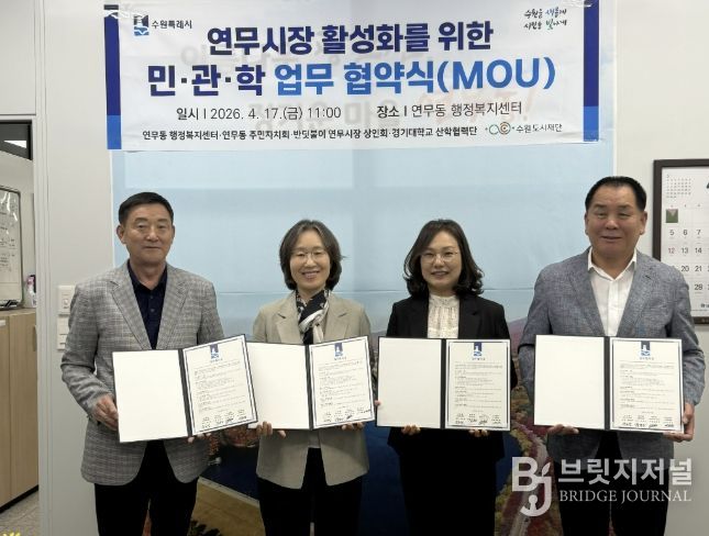 브릿지저널 김경미 기자 | 수원시 장안구 연무동 행정복지센터와 주민자치회, 반딧불이연무시장상인회, 경기대학교 산학협력단은 지난 17일, 각 기관의 긴밀한 상호 협력과 유대관계 강화를 위한 업무협약을 체결했다.