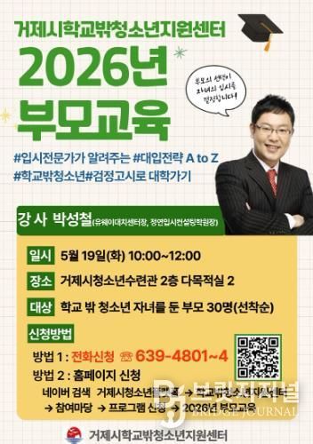 브릿지저널 김경미 기자 | 거제시학교밖청소년지원센터에서는 5월 19일 학교 밖 청소년 자녀를 둔 부모를 대상으로'2026년 학교 밖 청소년 부모교육'을 실시한다고 밝혔다.