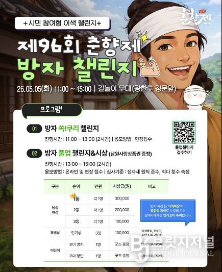 브릿지저널 윤나영 기자 | 대한민국 대표 축제인 ‘제96회 춘향제’가 춘향전 속 방자 캐릭터의 재치와 기개를 현대적으로 재해석한 참여형 프로그램 ‘방자 챌린지’를 선보인다. 이번 프로그램은 관람객들에게 더욱 젊고 활기찬 에너지를 전달하며 축제 분위기를 한층 고조시킬 전망이다.