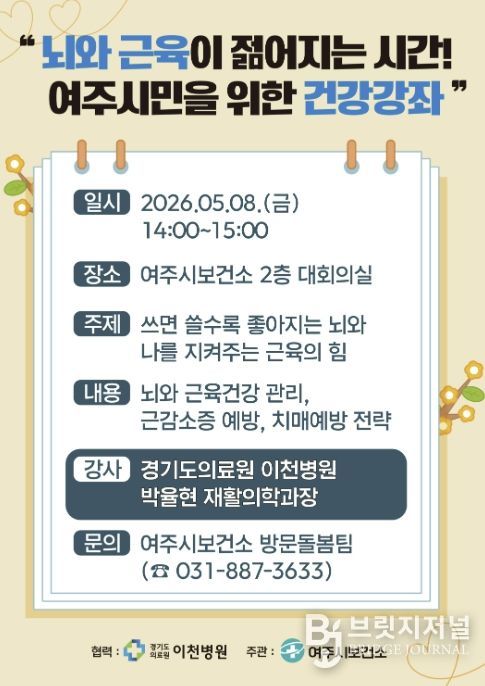 브릿지저널 김경미 기자 | 여주시보건소 건강증진과는 오는 5월 8일 오후 2시, 보건소 2층 대회의실에서 여주시민을 위한 건강강좌 '뇌와 근육이 젊어지는 시간!'을 개최한다고 밝혔다.