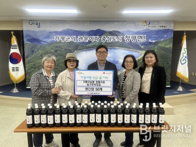 브릿지저널 김경미 기자 | 가평군농협 청평지점 농가주부모임이 20일 지역 내 어려운 이웃을 위해 직접 만든 맛간장 50개를 청평면에 기탁했다.