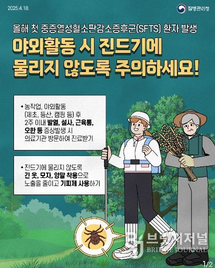 중증열성혈소판감소증후군(SFTS)은 농작업, 임산물 채취, 등산 등 야외활동 과정에서 진드기에 물려 감염되는 질환으로, 주로 봄부터 발생한다. 잠복기는 5일에서 14일이며, 38도 이상의 고열과 오심, 구토, 설사 등 소화기 증상이 나타날 수 있다. 치명률이 높고 예방 백신과 치료제가 없어 주의가 필요하다.
