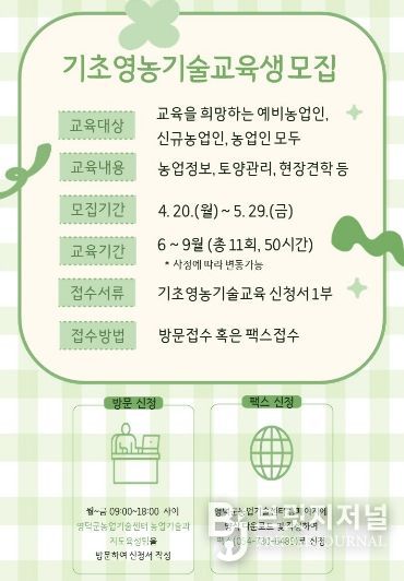 이번 교육은 신규 농업인과 귀농·귀촌인을 포함해 수강을 원하는 예비·현직 농업인 모두 참여할 수 있으며, 농업경영 전반부터 현장 견학까지 다양한 교육을 제공해 안정적인 영농 기반을 마련할 수 있도록 지원하게 된다.