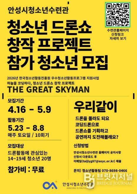 브릿지저널 김경미 기자 | 안성시청소년수련관은 미래 디지털 인재 양성을 위한 청소년 참여형 프로그램 '하늘을 코딩하다, 청소년 드론쇼 창작 프로젝트 ‘THE GREAT SKYMAN’'에 참여할 청소년을 4월 16일 ~ 5월 8일까지 모집한다고 밝혔다.