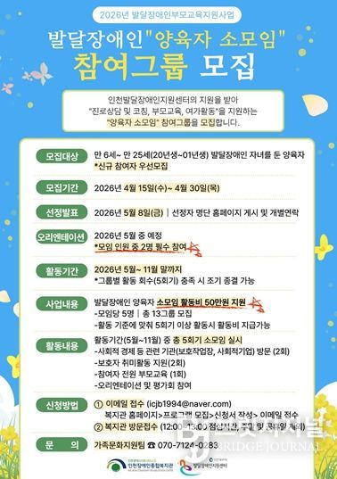 브릿지저널 김경미 기자 | 인천시사회서비스원 소속 인천장애인종합복지관은 ‘발달장애인 양육자 소모임’ 참여자를 모집한다고 21일 밝혔다.