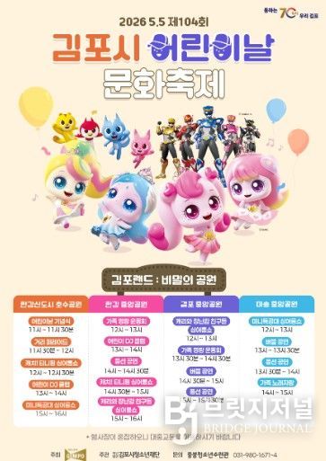 브릿지저널 김경미 기자 | 오는 5월 5일, 김포 전역이 하나의 거대한 놀이공원이 된다. 김포시는 시가 주최하고 김포시청소년재단에서 주관하는 제104회 어린이날 문화축제가 한강신도시호수공원(마산동), 한강중앙공원(장기동), 걸포중앙공원(걸포동), 마송중앙공원(통진읍)에서 동시 개최된다고 20일 밝혔다.