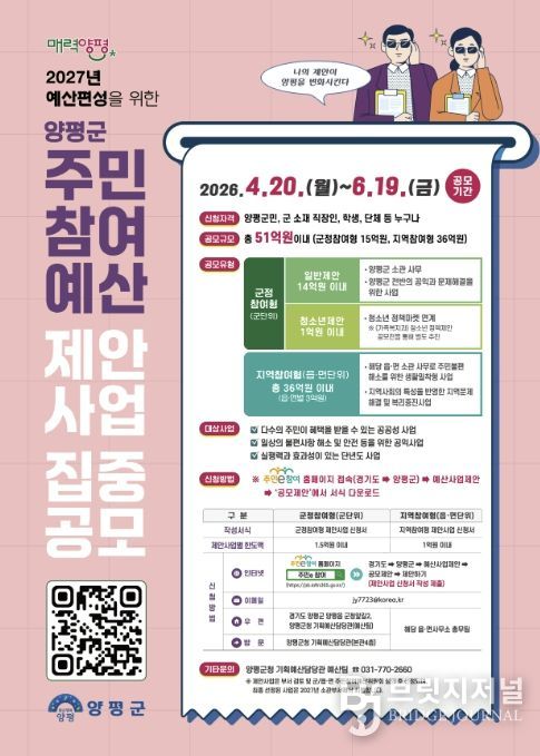 브릿지저널 김경미 기자 | 양평군은 오는 6월 19일까지 2027년 예산에 반영할 ‘주민참여예산 제안사업’을 집중 공모한다고 밝혔다.