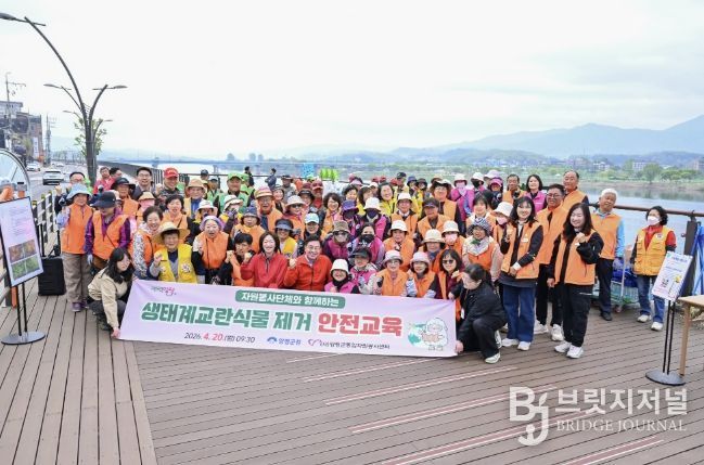 브릿지저널 김경미 기자 | 양평군종합자원봉사센터는 지난 20일 오전 9시 양평남한강테라스 하부 산책로 일대에서 ‘2026년 자원봉사 리빙랩 3고 YP(줍고·잇고·지키고) 사업’의 일환으로 생태계 교란 식물 제거 활동을 실시했다.