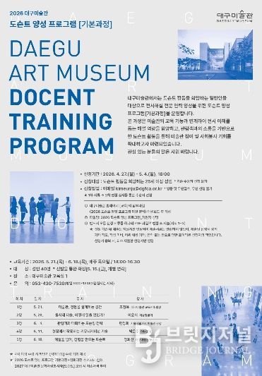 브릿지저널 김진석 기자 | 대구문화예술진흥원 대구미술관은 도슨트 활동을 희망하는 25세 이상 일반인을 대상으로 전시 해설 전문 인력 양성을 위한 ‘도슨트 양성 프로그램(기본과정)’을 운영하고, 2026년 교육생을 모집한다.