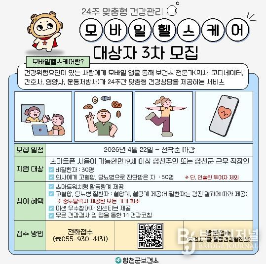 브릿지저널 김경미 기자 | 합천군보건소(소장 안명기)는 22일부터 모바일헬스케어 대상자 3차 모집을 시작한다.