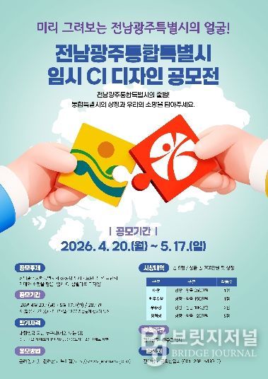 브릿지저널 김경미 기자 | 전라남도와 광주광역시는 통합특별시의 상징성을 나타내는 전남광주통합특별시 임시 CI 디자인을 5월 17일까지 28일간 전국민을 대상으로 공모한다고 밝혔다.