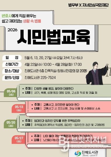 브릿지저널 김경미 기자 | 창원특례시 진해도서관(과장 이영화)은 오는 5월 매주 수요일 저녁 7시에 시민의 법률 이해도 향상과 일상 속 법적 문제 대응을 돕기 위해 ‘2026년 시민법교육’을 운영한다고 밝혔다.