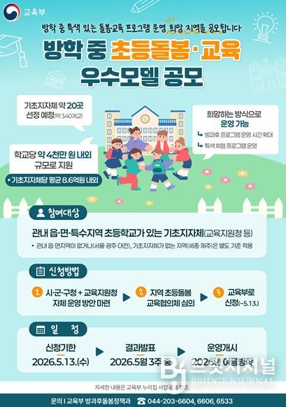 브릿지저널 김경미 기자 | 교육부는 4월 22일부터 5월 13일까지 2026년 방학 중 초등돌봄‧교육 우수모델을 운영할 기초지방자치단체 선정을 위한 공모를 실시한다.