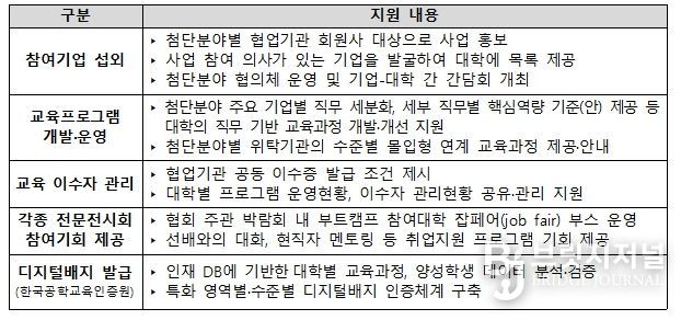 분야별 협업기관은 △참여기업 섭외, △교육프로그램 개발 및 운영, △교육 이수자 관리, △각종 전문 전시회 참여기회 제공 등 사업 운영의 전 단계에서 대학-기업의 교류를 활성화하고, 학생들을 지원하는 역할을 한다. 또한, 대학별 교육과정을 분석하여, 특화 영역별·수준별 디지털 배지 발급을 지원하는 등 인증 체계를 구축하기도 한다.