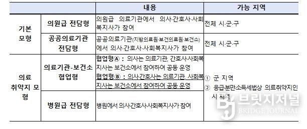 이번 공모에 신설된 모형을 포함한 재택의료센터 참여 모형은 다음 표와 같다.